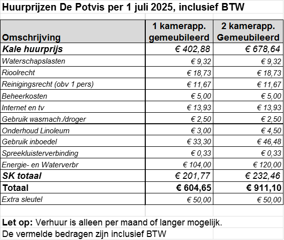 Elk appartement is gemeubileerd en gestoffeerd, inclusief een eigen keuken, douche en toilet.
