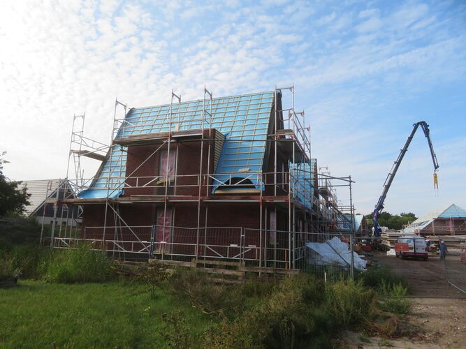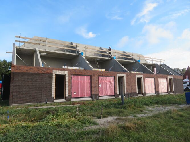 Alle betoncasco’s staan! Bij de eerste vier woningblokken liggen de daken erop en de trappensteller is druk bezig bij blok twee. Ook de eerste dakgoten zijn gemonteerd. De dakkapellen krijgen nu hun dakbedekking, zodat binnenkort de dakpannen kunnen volgen. Het gaat zichtbaar de goede kant op!